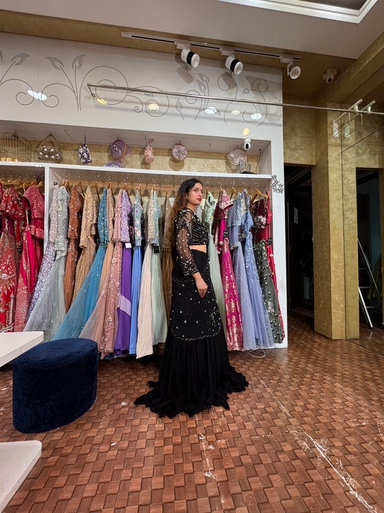Step into timeless elegance with this black fish cut lehenga, beautifully paired with a sheer drape dupatta.