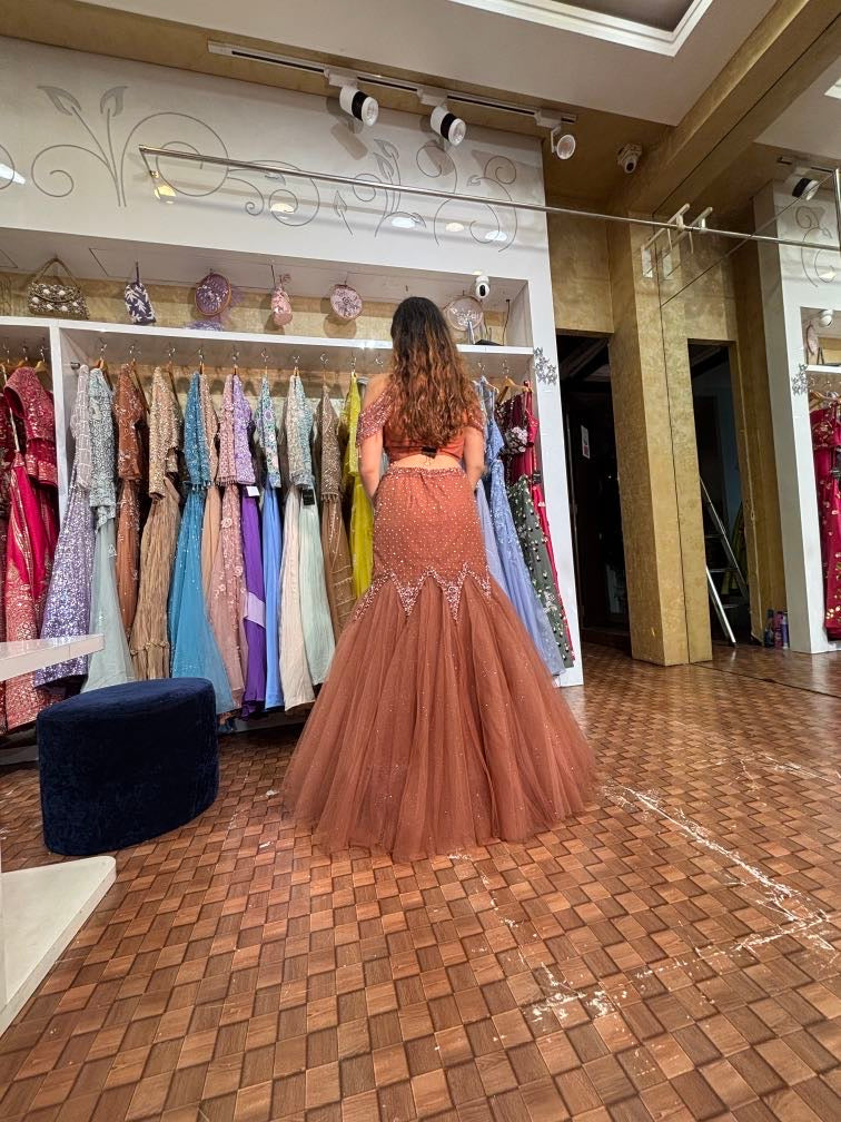 Bring grace and glamour together with this rust peach-toned fish cut lehenga, intricately embellished with sequins, pearls, and bead embroidery. The cold-shoulder blouse with delicate tassel drops adds a chic contemporary charm, while the flattering mermaid silhouette gives a stylish edge, perfect for weddings and festive occasions.