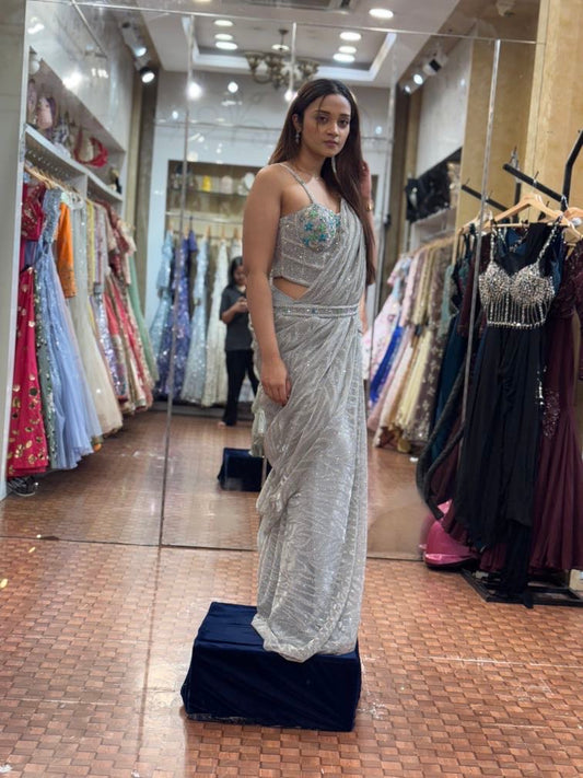 Simmering Silver pleated saree with corset blouse