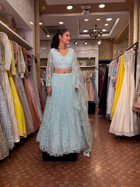 Grey Lehenga And Crop top Embellished With Pearl, cutdana and zardosi work