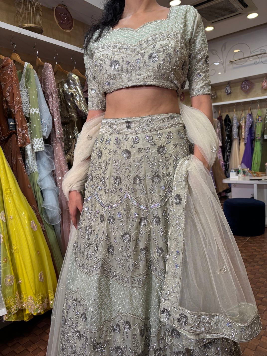 grey handwork lehenga on shining organza fabric.